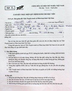 – 01 Giấy cam kết (có người giám hộ ký tên nếu học viên dưới 18 tuổi); -> Download