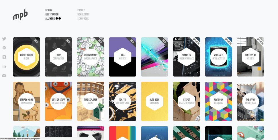 Họa sĩ minh họa kiêm nghệ sĩ Merijn Hoss có cách tiếp cận khách hàng bình dân hơn. Hoss tạo ra các tác phẩm nghệ thuật ảo giác với những chi tiết đẹp mắt, nhưng portfolio của mình anh ấy lại trình bày ở định dạng khá đơn giản. Đây là một trong những portfolio với  cách tiếp cận truyền thống nhất mà tôi đưa vào danh sách này. Portfolio của Hoss gần như không thể hiện sự hào nhoáng như một số thiết kế khác, nhưng nó vẫn hiệu quả  khi đặt các hình thu nhỏ đầy màu sắc bật ra khỏi nền trắng của thư viện các tác phẩm. Sau khi nhấp vào, hình ảnh sẽ lớn hơn và một mô tả ngắn sẽ hiện ra. Thiết kế của Hoss là bằng chứng cho thấy rằng bạn không cần phải có  kĩ năng cao siêu để tạo ra sự tác động lớn.