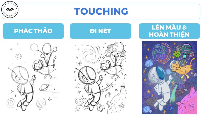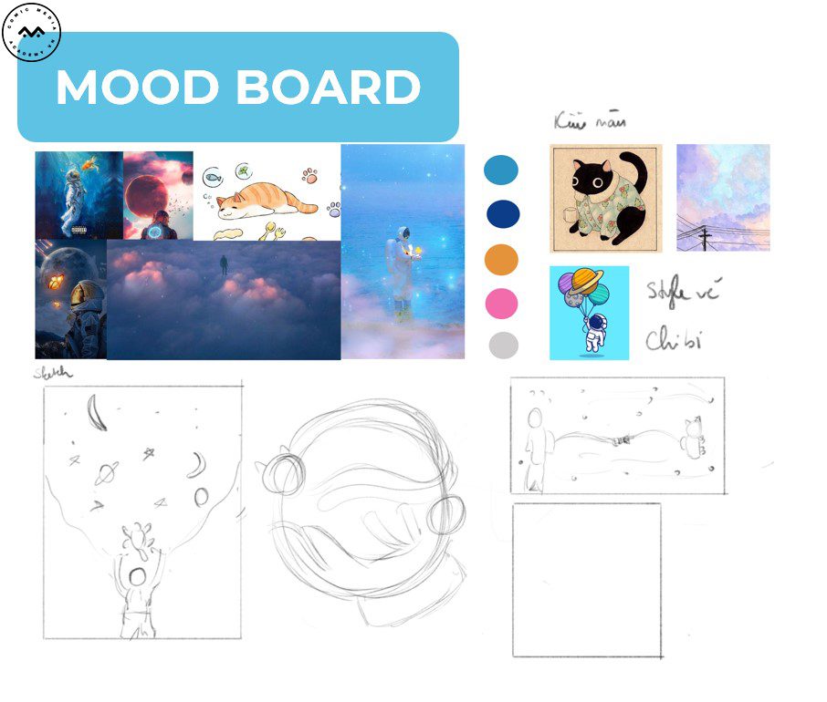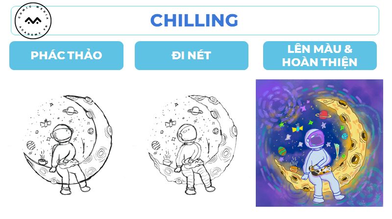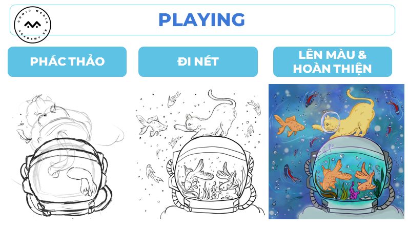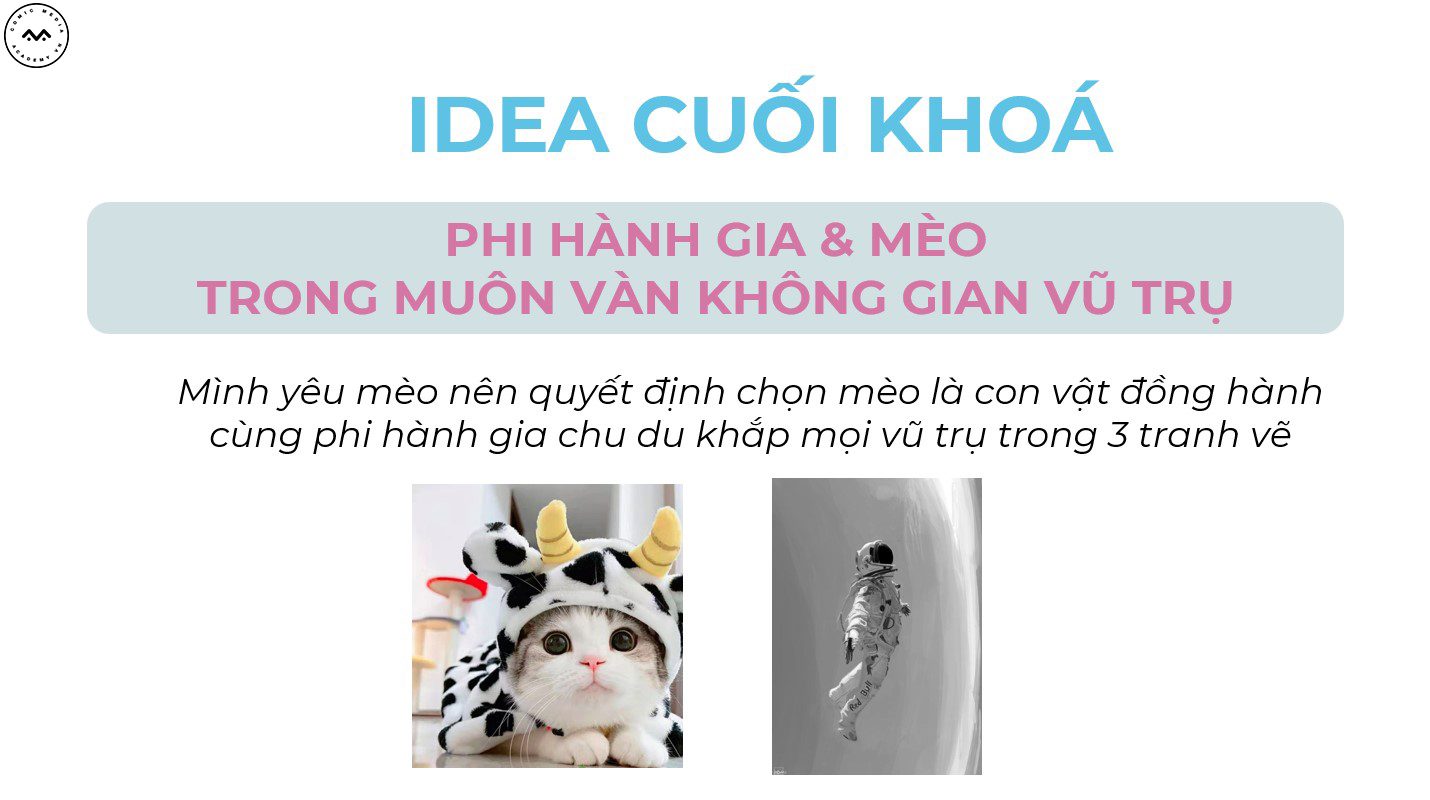 Lấy ý tưởng từ chú mèo, nhân vật mà Yến Vy yêu thích để tạo nên những bức tranh minh họa thú vị giữa phi hành gia và chú mèo vàng. Cùng xem qua quá trình hoàn thiện bài cuối khóa của Yến Vy nhé!
