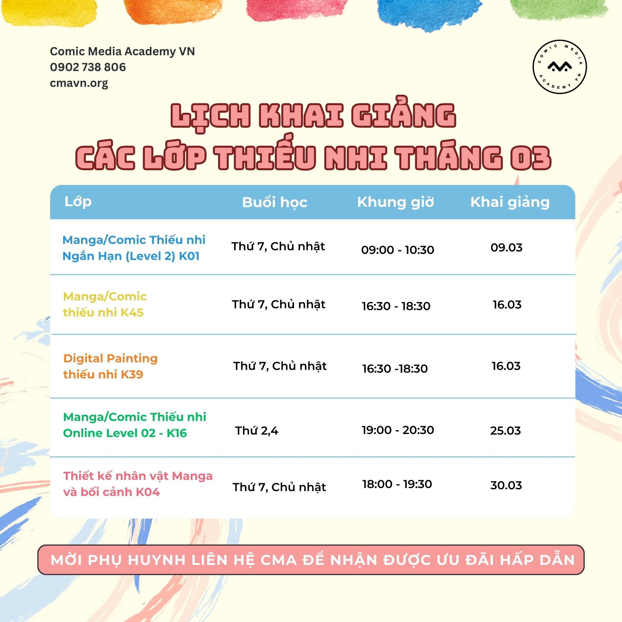 🌻 Các khóa học được khai giảng thường xuyên với nhiều khung giờ vào cuối tuần thuận tiện cho bé tham gia