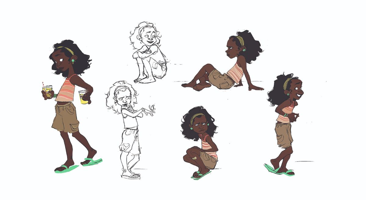 Myers chọn ra những khoảnh khắc nhỏ trong kịch bản Over the Moon và minh họa lại chúng. Cô không chỉ vẽ những tư thế tĩnh mà còn vẽ Fei Fei đang đạp xe hoặc ôm chú thỏ cưng của mình. Myers muốn những hình ảnh này trông thật năng động để gợi lên đặc điểm nổi bật của nhân vật Fei Fei.