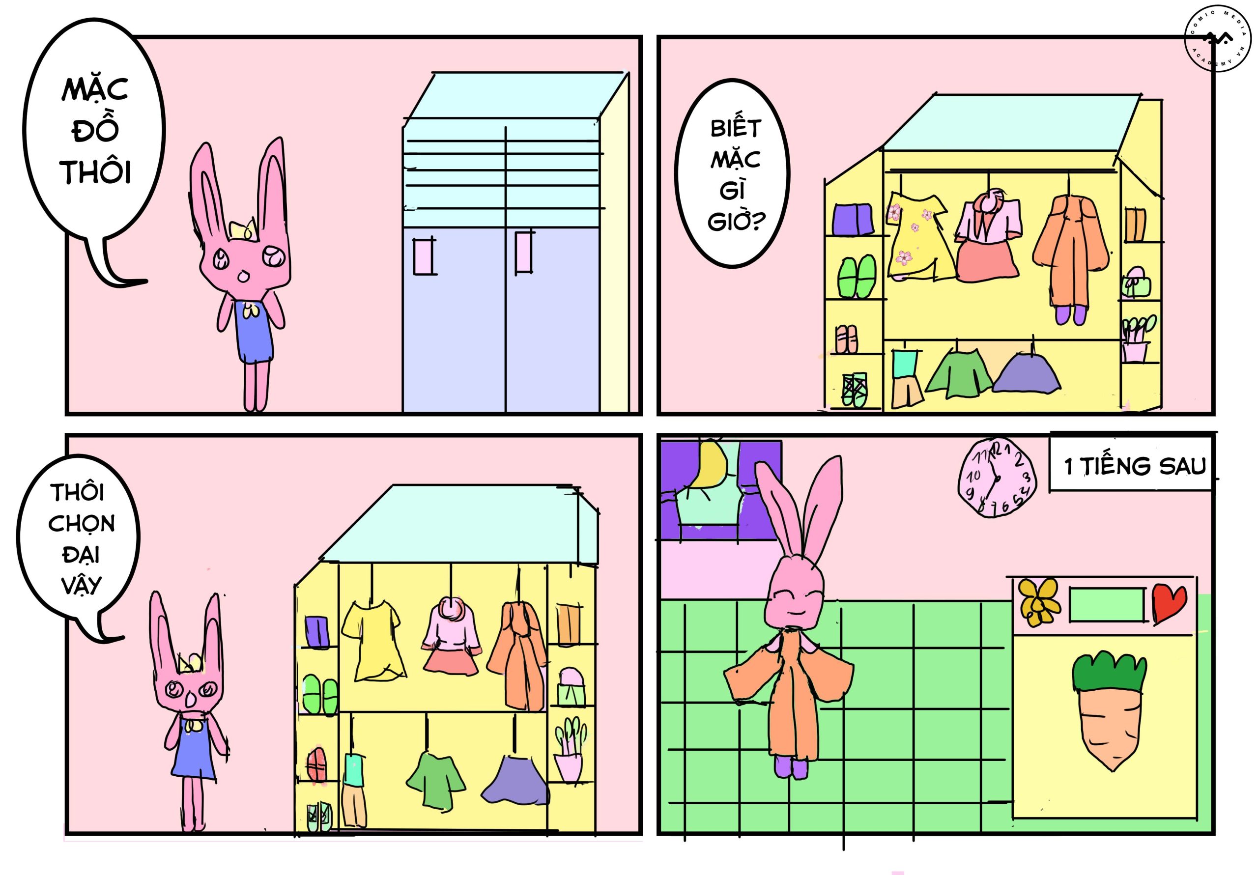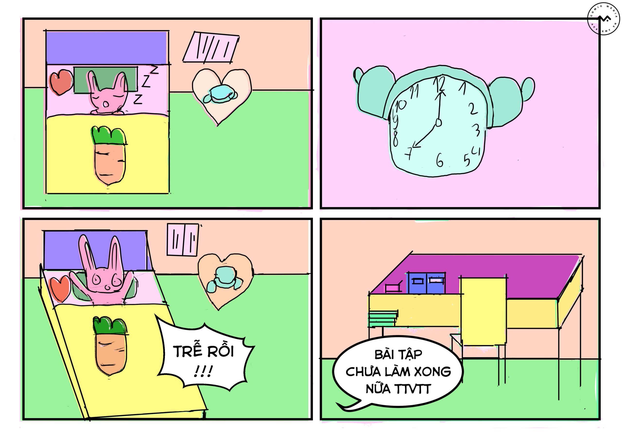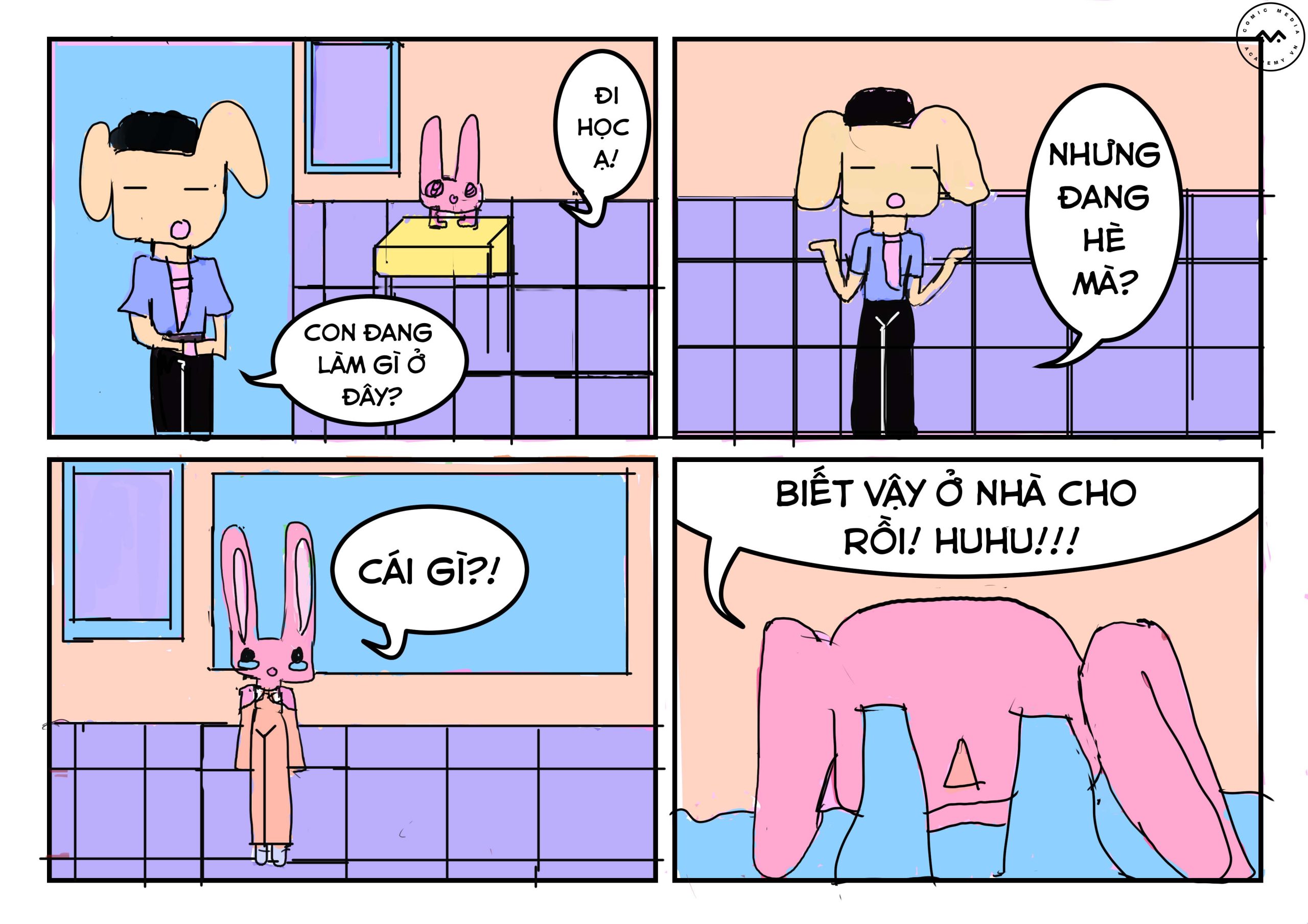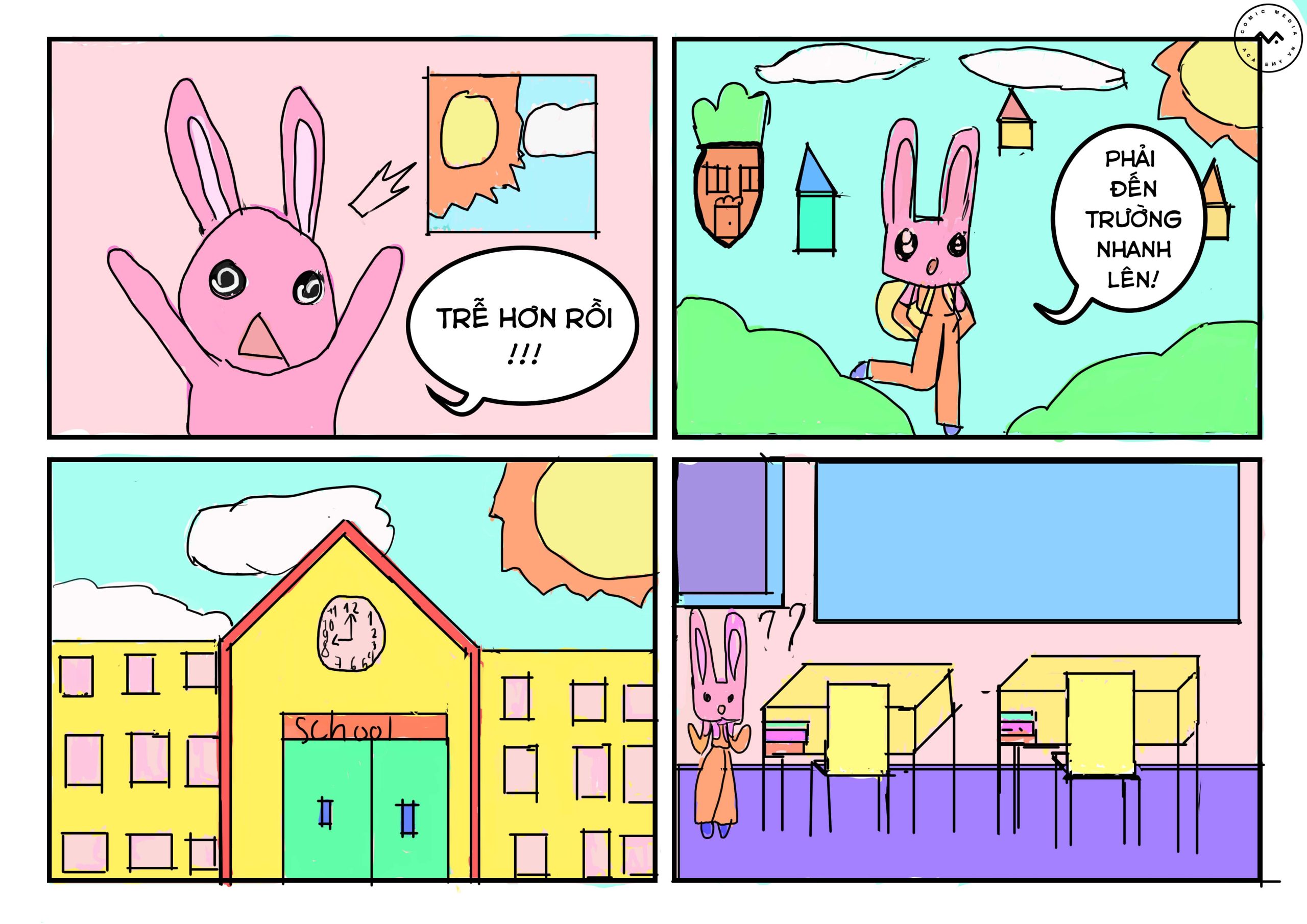“Chuyện bé thỏ” – Bài cuối khóa của bé Võ Trần An Nhiên, một cậu chuyện rất dễ thương, nhân vật thỏ ngủ quên và thức dậy với trang thái lo lắng vì trễ giờ, nhưng đến lớp thì lại …, cùng xem tiếp câu chuyện của bé để xem có giống câu chuyện của chúng ta không nhé!