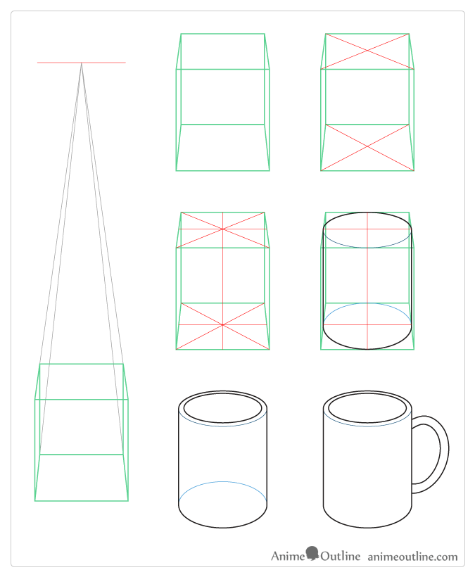 Nếu vẽ ca uống nước này theo đúng phối cảnh, đáy ca sẽ được vẽ tròn hơn (giãn ra theo chiều dọc hơn so với miệng ca) do trong trường hợp này, ca uống nước nằm dưới tầm mắt người xem và vì vậy, miệng ca sẽ nằm gần tầm mắt người xem. Ngược lại, miệng ca sẽ tròn hơn nếu ca uống nước nằm trên tầm mắt người xem.