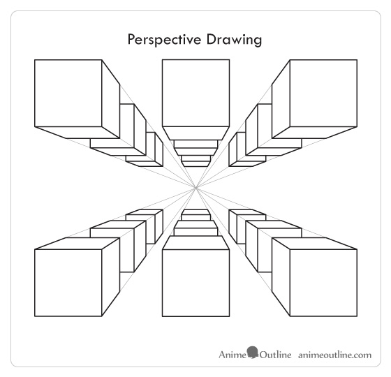 Khối hộp thường có các cạnh dài bằng nhau. Nhưng trong hình minh họa trên, bạn thấy các cạnh của khối hộp thứ nhất (vẽ theo phối cảnh) càng lùi xa càng nhỏ lại như thế nào.
