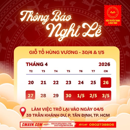 🌱 Viện Truyện tranh & Hoạt hình (CMA) sẽ nghỉ lễ Giổ tổ Hùng Vương vào ngày 26 và 27/4. Ngày 28 và 29/4 CMA vẫn hoạt động. Hiện tại CMA đang trong quá trình di dời cơ sở, các bạn có nhu cầu đến tư vấn trực tiếp, vui lòng liên hệ hotline CMA để được hẹn thời gian và địa điểm phù hợp nhất nhé!