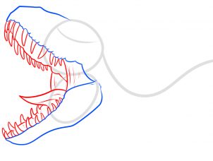 Bước 3: Vẽ phần má trong hàm trên và hàm dưới thượng khủng long bằng ¾ kích thước của phần hàm đã vẽ. Sau đó, vẽ lưỡi và vẽ những chiếc răng sắc nhọn như dao cạo của khủng long như hình vẽ.